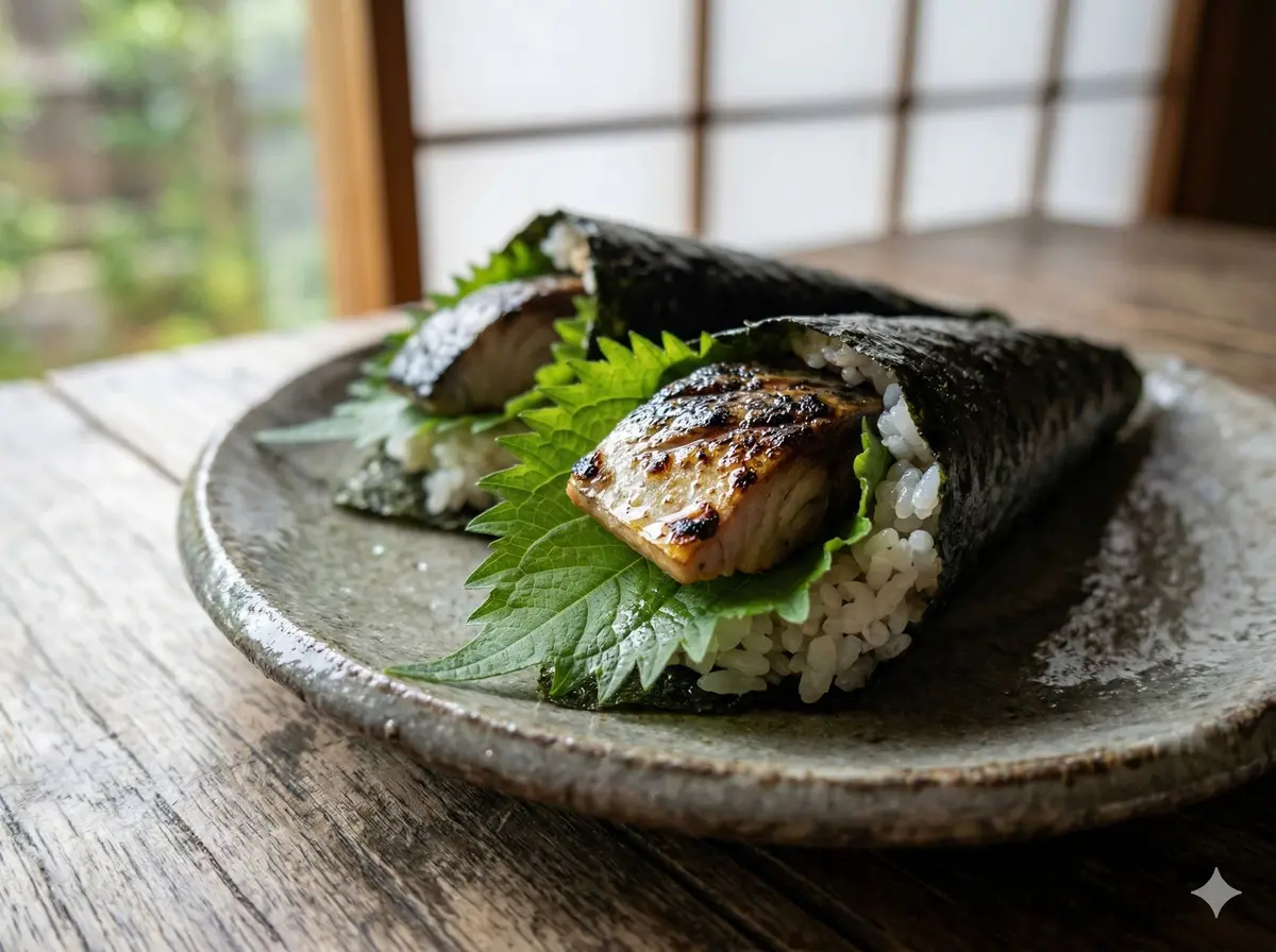 Flame-seared mackerel fillet with shiso (perilla leaf) and a touch of soy-dashi seasoning, wrapped in rice and seaweed — smoky, oily, and deeply savory.