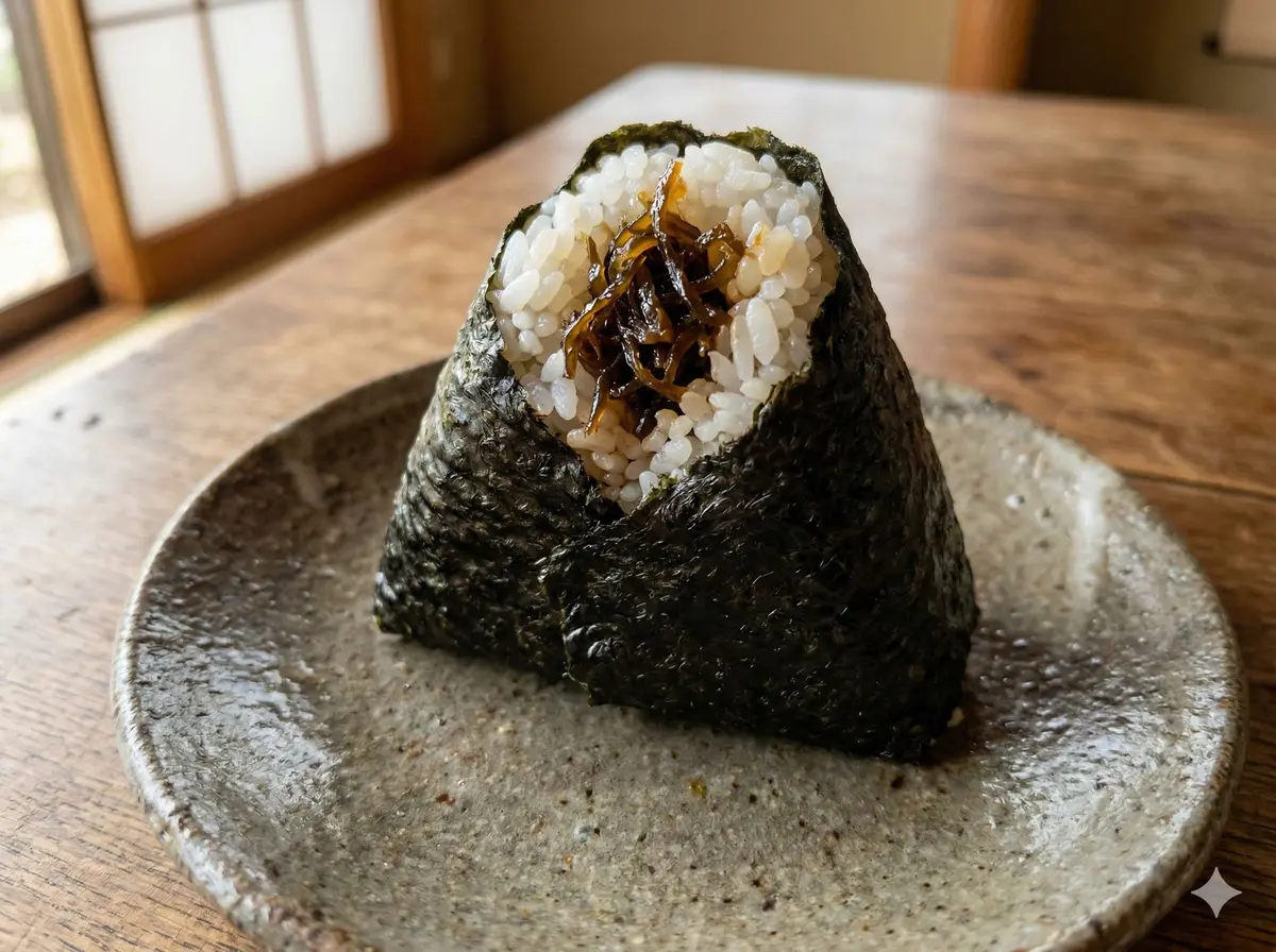 Tender strips of kelp simmered in sweet soy sauce, delivering a deep, savory umami punch inside a rice ball.