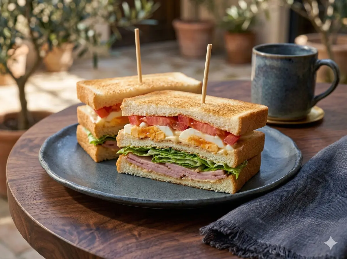 A multi-layered sandwich with chicken or ham, boiled egg, lettuce, and tomato stacked between toasted bread.