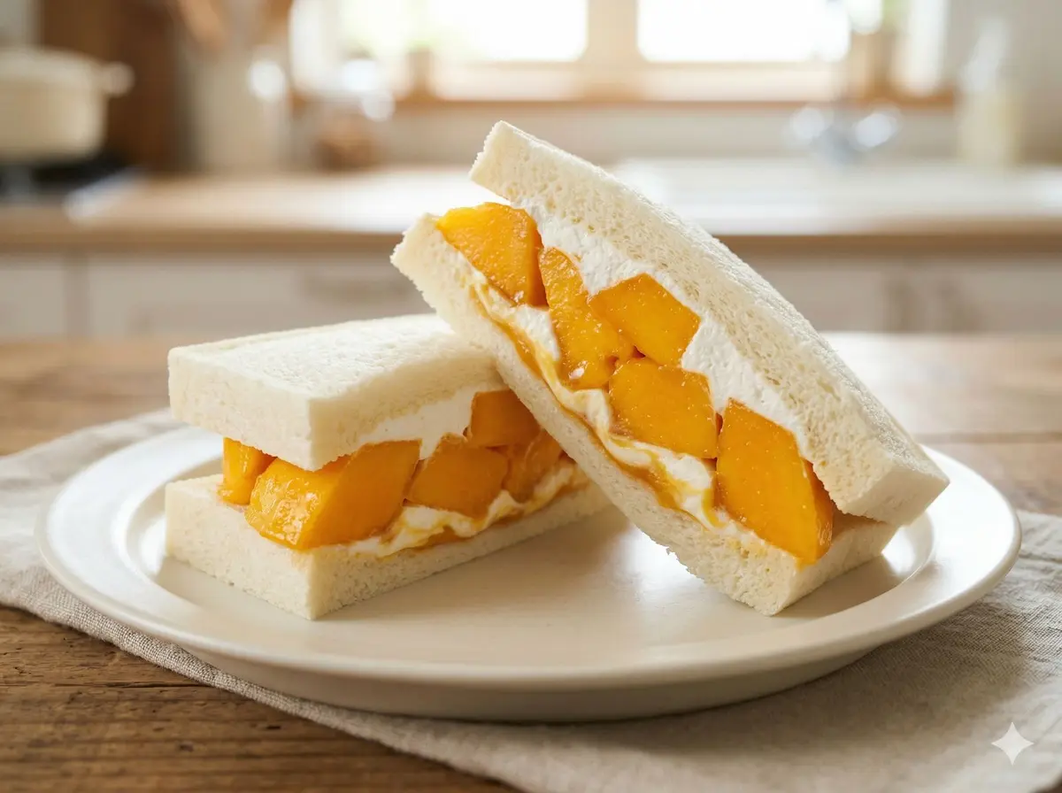Ripe mango pieces with mango sauce and whipped cream between soft white bread, delivering a burst of tropical sweetness.
