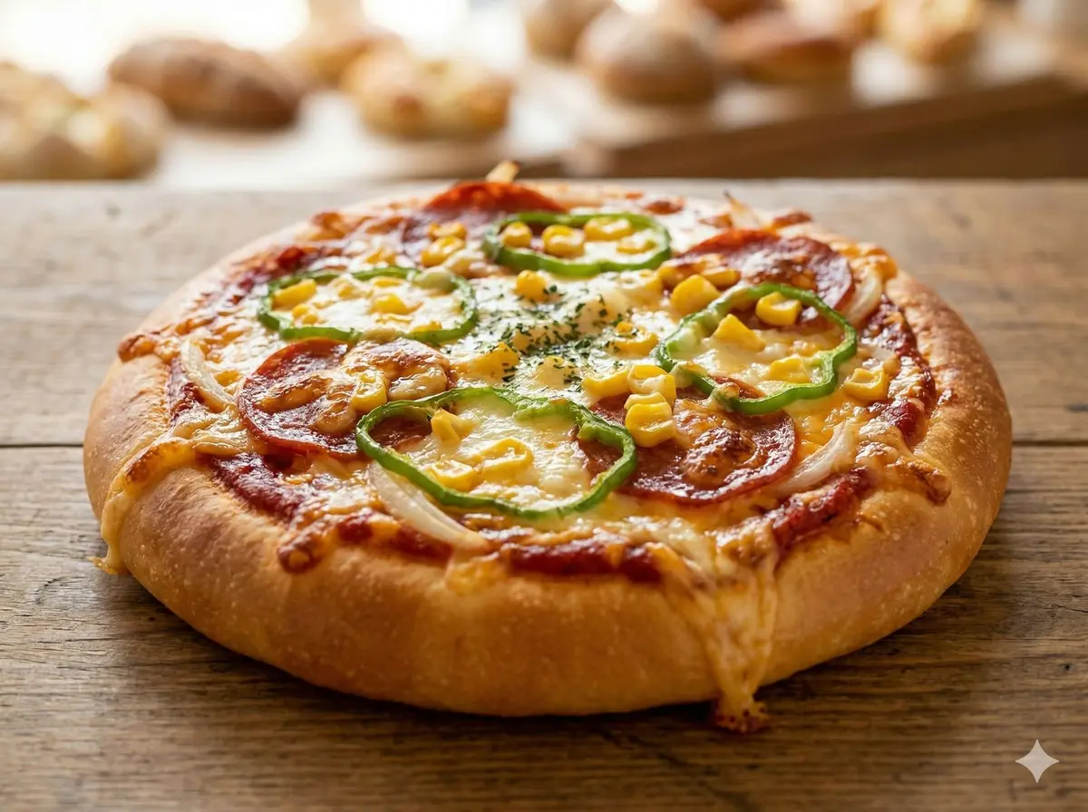 A fluffy bun topped with tomato sauce, melted cheese, and various toppings like salami, peppers, or corn — a Japanese bakery take on pizza.